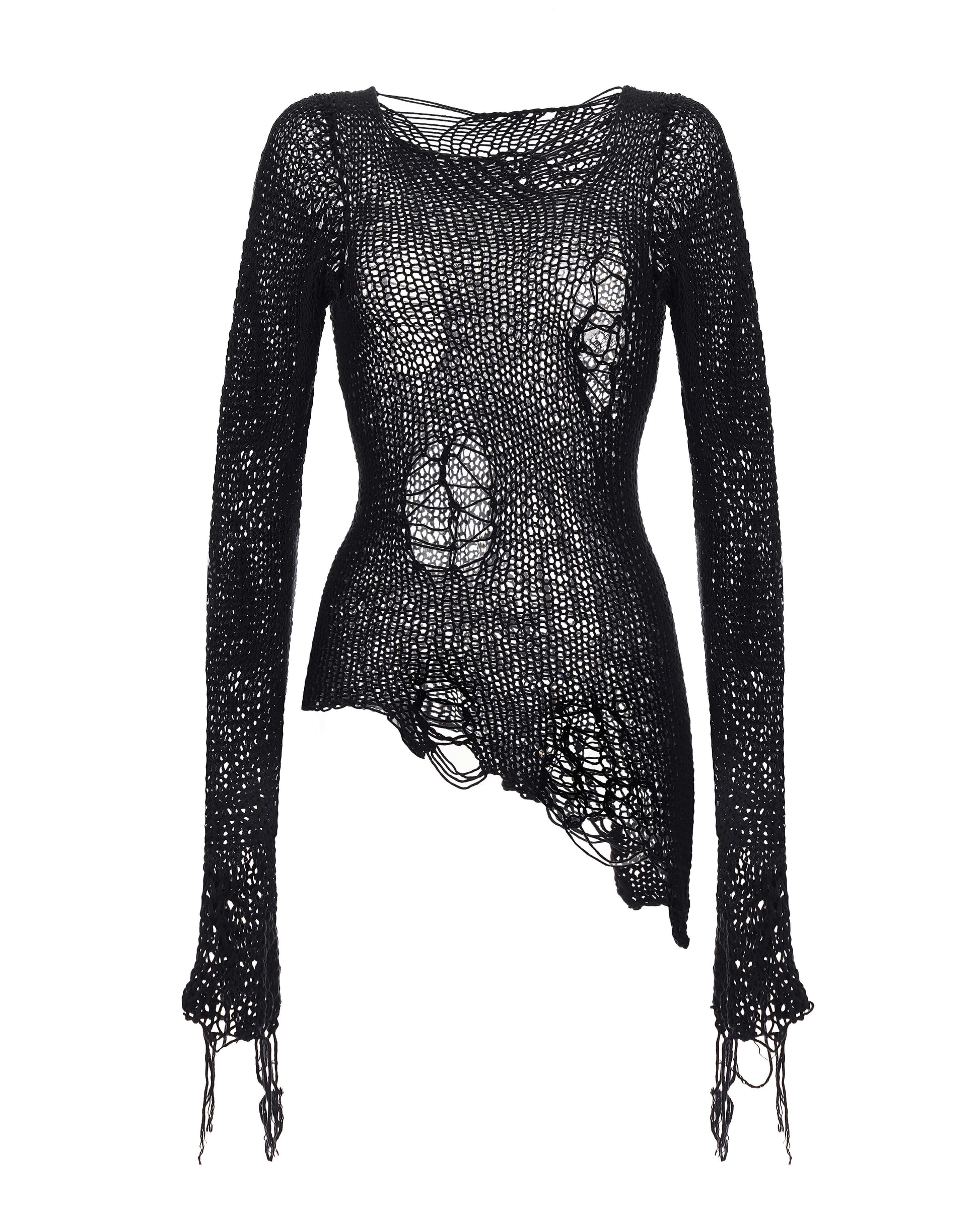 The hand-knitted top is long with eyelets and long sleeves, asymmetrical hem.