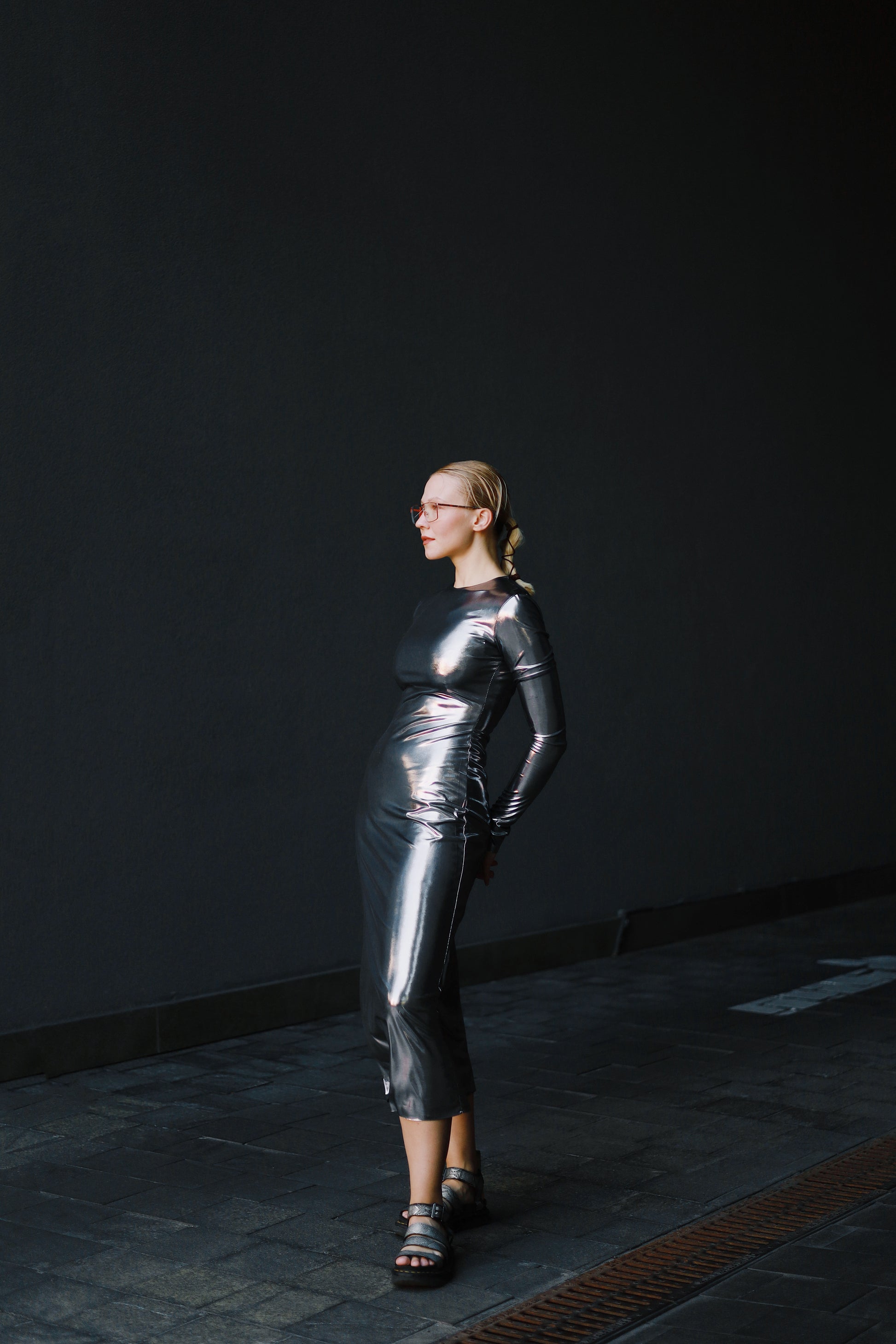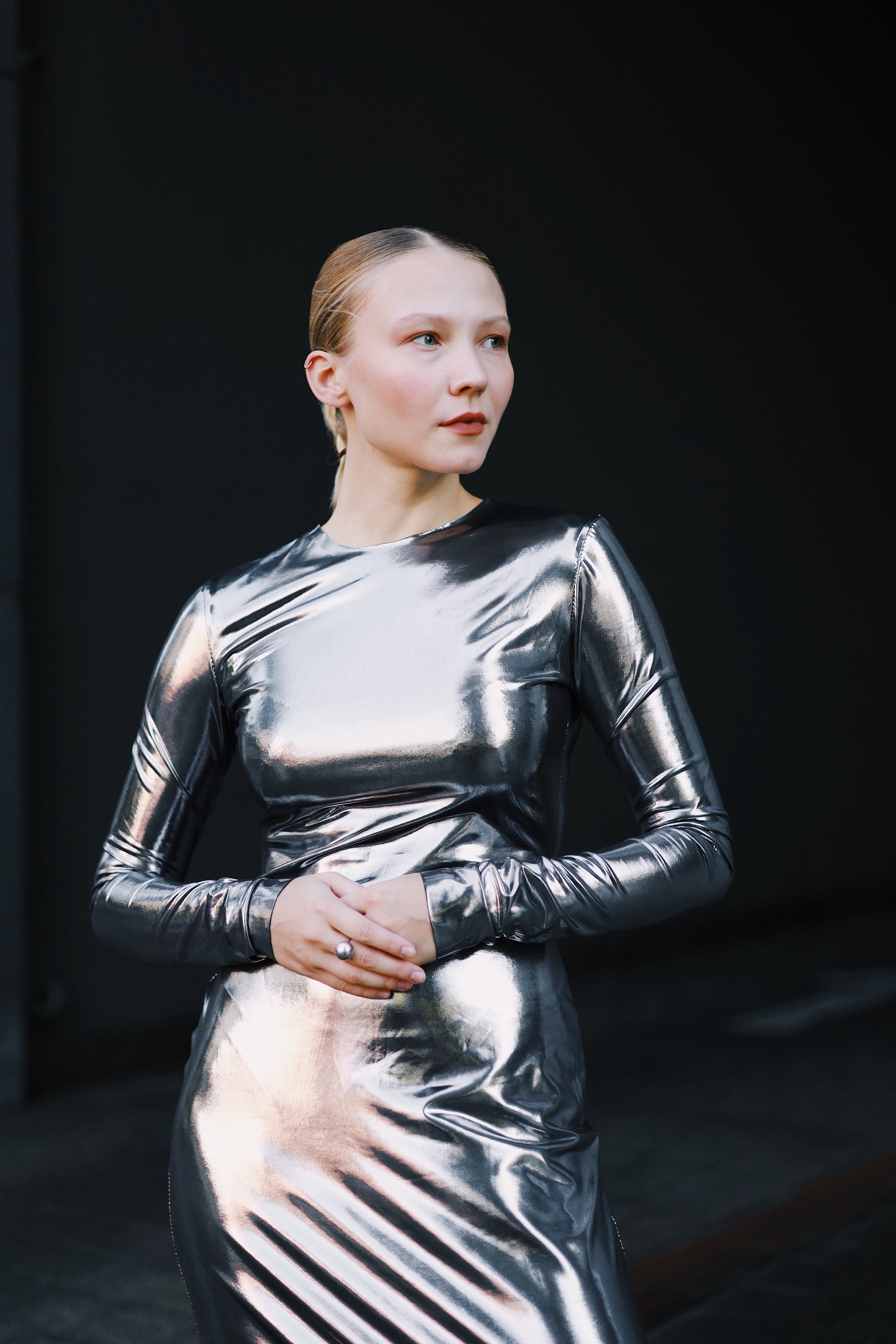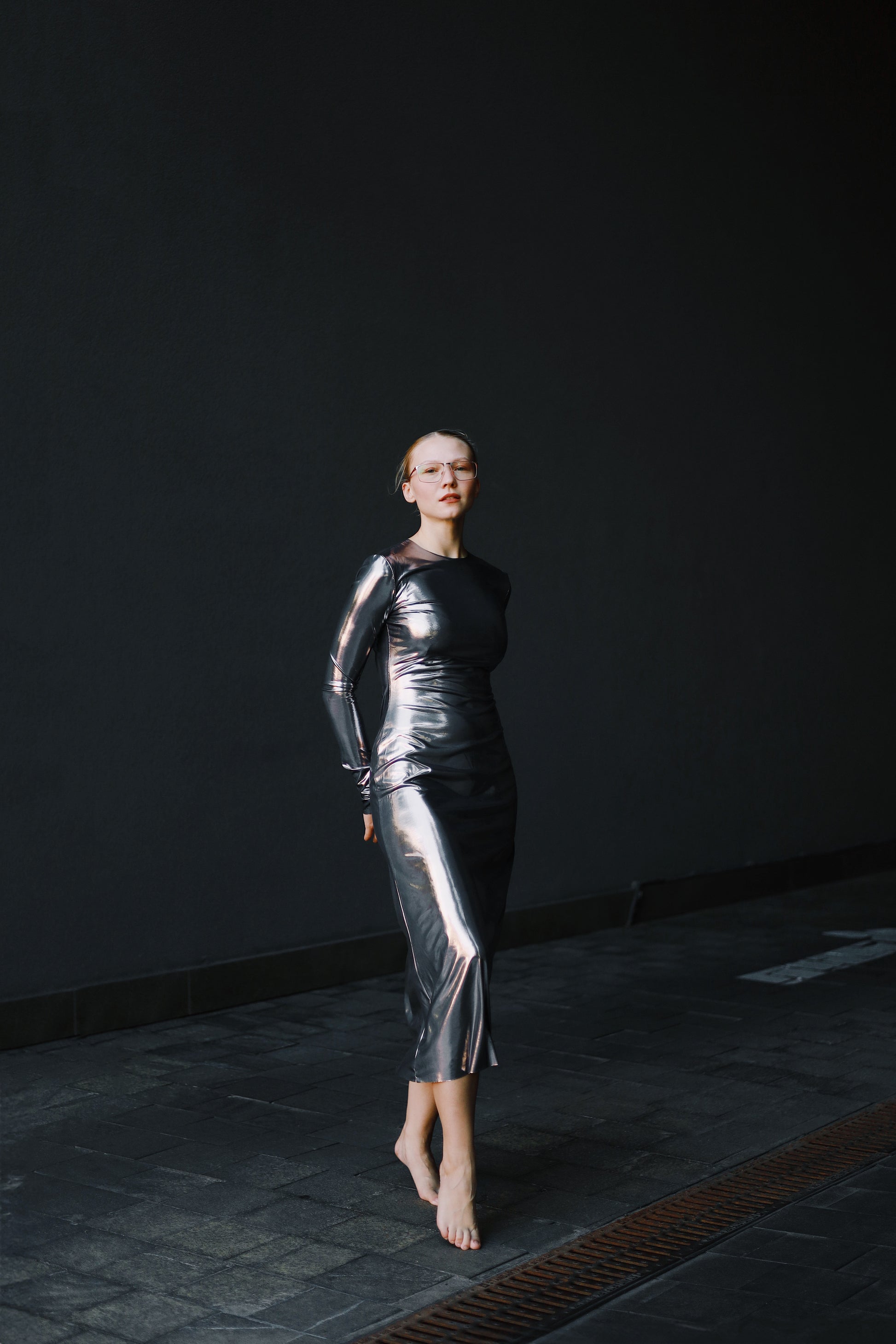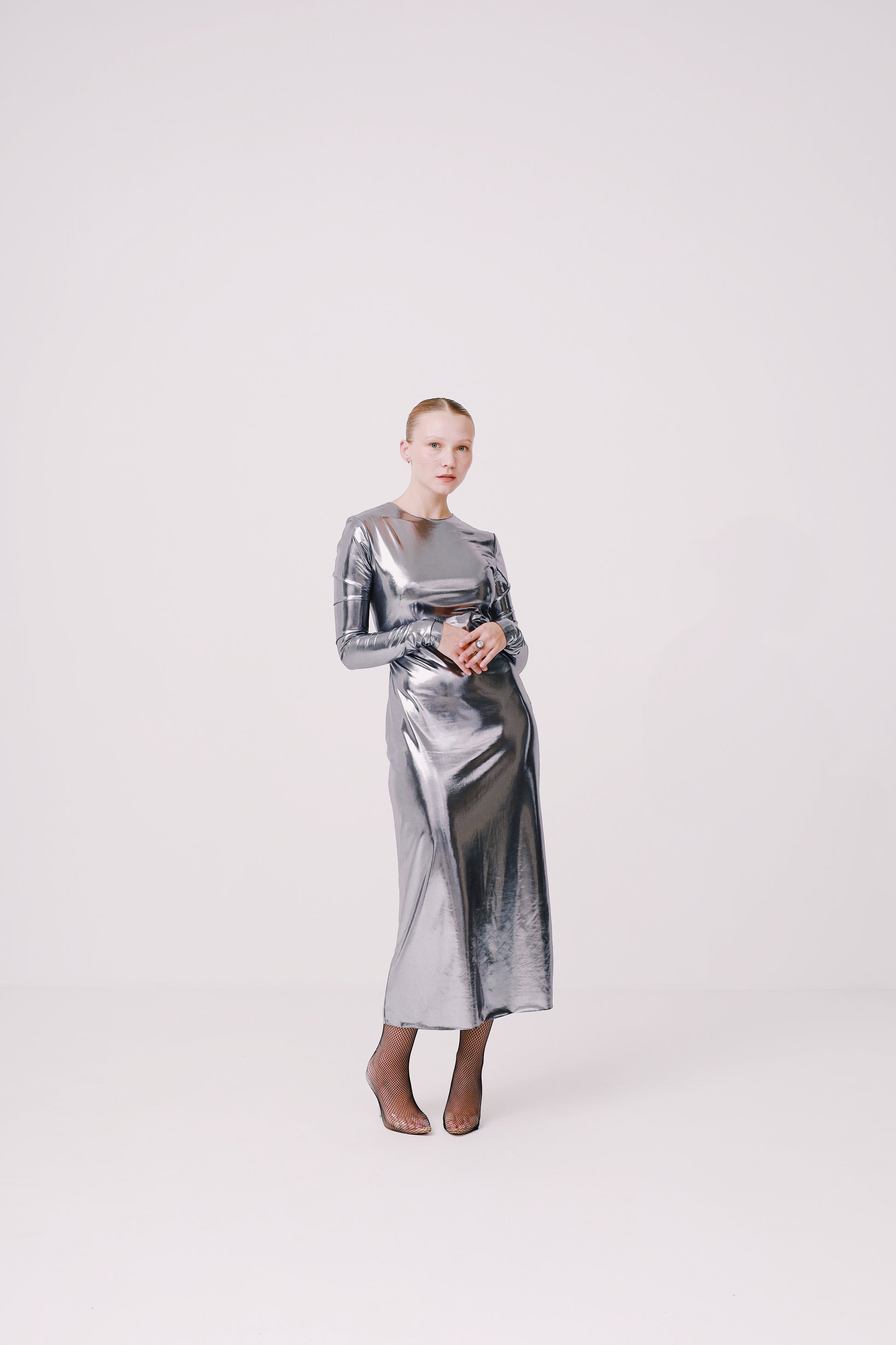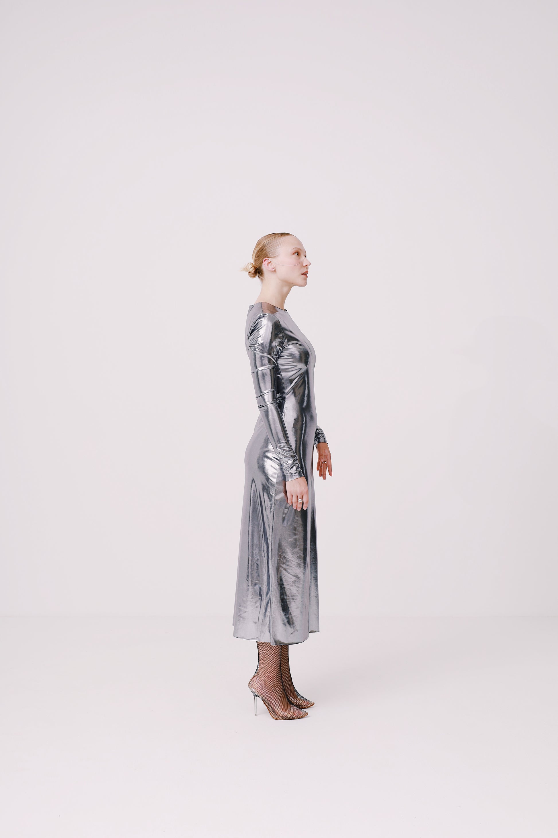 Elastic mesh with a thick silver coating. The coating does not crack while wearing the dress, and the fabric itself is pleasant to the body.